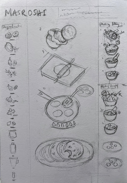 I then proceeded to visualize the main steps I identified from the recipe and made numerous sketches. It took quite a bit of time since it was challenging to communicate all the information with such a minimal approach.